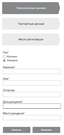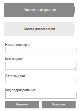 3. В открывшейся форме необходимо заполнить поля “Персональные данные” и “Паспортные данные”, а также поля в форме “Место регистрации”. Подтвердите Ваше согласие на обработку персональных данных.