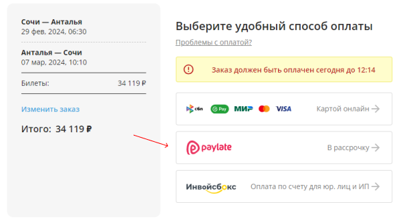 1. Забронируйте билет на сайте АО Авиакомпания «ИрАэро». В способах оплаты выберите пункт «В рассрочку».
